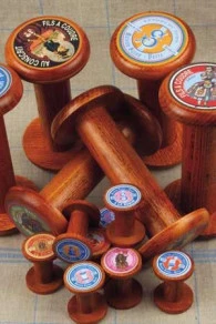 Jolie bobine en bois vernie à l’ancienne avec deux étiquettes Sajou roses.