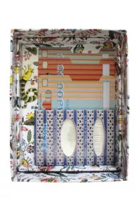 Cette boîte est composée de deux plateaux, celui du dessus étant amovible et pourvu, de chaque côté, de deux petits rubans Sajou facilitant la préhension. Elle est entièrement recouverte de papier décoré de notre motif fétiche Coquecigrues.