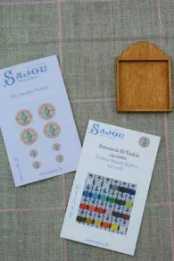Elle est recouverte d’un de nos papiers bleu et blanc, le motif des plateaux pouvant être différent. Son couvercle est, à l’extérieur, revêtu d’une étiquette représentant des enfants tenant les lettres du nom S A J O U, l’intérieur est décoré d’une étiquette rectangulaire Fil Au Conscrit.