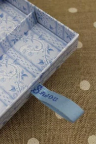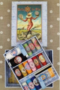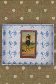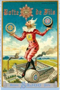 Elle est recouverte d’un de nos papiers bleu et blanc, le motif des plateaux pouvant être différent. C’est un funambule tenant une carte à fil Sajou en équilibre sur son nez qui décore l’étiquette sur la boîte. L’intérieur du couvercle est orné d’une étiquette rectangulaire Fil Au Conscrit.