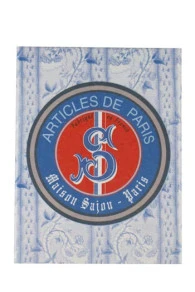 L’étiquette sur le dessus du couvercle représente la couverture de nos albums de broderie Sajou bleus et l’étiquette à l’intérieur du couvercle représente le dos de ces mêmes albums.