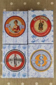 L’étiquette sur le dessus du couvercle représente la couverture de nos albums de broderie Sajou rouges et l’étiquette à l’intérieur du couvercle représente le dos de ces mêmes albums.