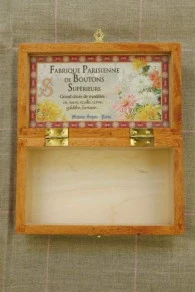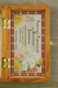 Cette boîte est en bois d’aulne. L’extérieur est entièrement verni, l’intérieur est laissé naturel. Le couverce est sérigraphié Boutons-Sajou-Paris. Cette technique ancienne de marquage peut présenter certains petits défauts, ce qui participe au charme de cette réédition. L’intérieur du couvercle est recouvert d’une belle étiquette à l’ancienne.