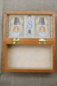 Cette boîte est dans l’esprit de celle que l’on trouvait autrefois dans les catalogues de vente comme ceux du Bon Marché ou de la Samaritaine. À l’époque, en effet, les ménagères et les couturières achetaient certaines fournitures en grande quantité, proposées dans de telles boîtes.