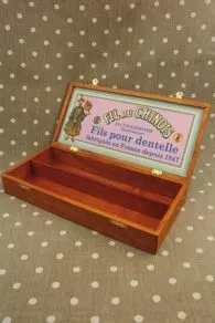 Cette belle boîte en bois rectangulaire avec ses étiquettes bleues, vous permettra de ranger vos bobines de fil. À l’intérieur, une séparation, vous permettra d’aligner côte à côte deux rangées de bobines. À titre d’exemple, elle peut contenir :