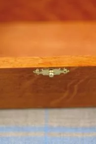 Une superbe étiquette Fils de coton sur fond bleu décore le dessus du couvercle, ainsi que son intérieur. Le corps et le cadre du couvercle de cette boîte sont faits en bois d’aulne, le dessus du couvercle est en contreplaqué de bouleau. Elle se ferme au moyen d’un petit fermoir en métal.