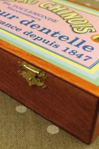 Une grande étiquette Fils pour dentelle sur fond rose décore le dessus du couvercle, ainsi que son intérieur. Le corps et le cadre du couvercle de cette boîte sont faits en bois d’aulne, le dessus du couvercle est en contreplaqué de bouleau. Elle se ferme au moyen d’un petit fermoir en métal.