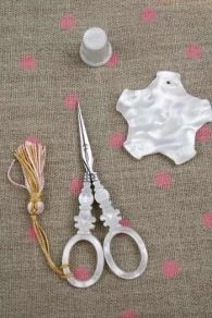 Cette carte à fil imitant la nacre est assortie à nos ciseaux et à notre dé de couturière façon nacre.