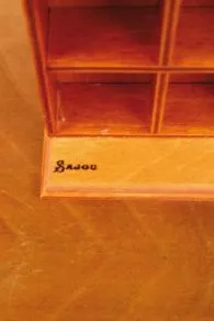 Deux marquages Sajou en noir : l’un en haut, l’autre sur le rebord du bas de l’étagère. Cette petite étagère est faite en contreplaqué de bouleau.