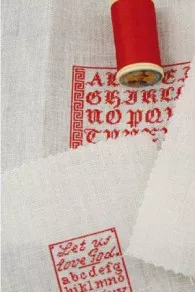 Le fil à gant est un fil de coton glacé, n° 120, à la fois fin et solide. Comme son nom l’indique, il était autrefois dévolu à la couture et à la réparation des gants. Les usages ont changé, mais le nom est resté. De nos jours, le fil à gant s’utilise pour les travaux de couture comme le patchwork et l’application, plutôt conseillé pour un usage à la main. Le fil à gant peut aussi être employé pour des broderies très fines au point de croix. Étant assez raide, il est très agréable à utiliser. Ici, une page d’albums Sajou réalisée sur de la toile de lin 12 fils au cm sur un fil.