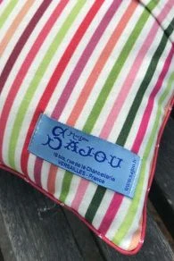 Housse de coussin 40 x 40 cm dont une face est faite du tissu principal de notre collection Les Roses de Joséphine et l’autre face dans le coordonné à rayures de la même collection. La finition est très raffinée, avec un passepoil Sajou sur fond bordeaux. Au dos, la fermeture se fait en portefeuille, avec un croisement large du tissu afin que cela ne baille pas. Étiquette Sajou bleu au dos. Ce format 40 x 40 est standard et vous trouverez très facilement un coussin pour garnir cette housse.