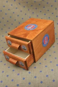 Petit meuble en bois décoré sur le dessus et chacun des côtés d’une étiquette ronde Sajou Articles de Paris.