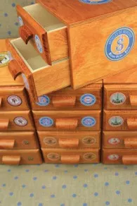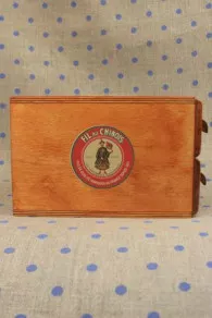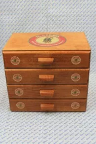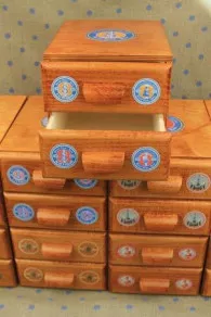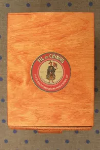 Petit meuble en bois dĂ©corĂ© sur le dessus et chacun des cĂ´tĂ©s d’une Ă©tiquette ronde Fil Au Chinois rouge.