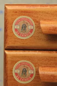 Chacun des deux tiroirs est décoré de deux petites étiquettes Fil Au Chinois rondes rouges (35 mm).