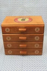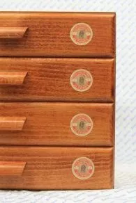 InspirĂ© par un modèle ancien, ce meuble est une fabrication de grande qualitĂ©. Il est en contreplaquĂ© de bouleau et son corps est clouĂ©-collĂ©. Le devant des tiroirs est fait en bois de peuplier. L’extĂ©rieur est teintĂ© couleur merisier, comme les autres objets de notre collection d’objets en bois, l’intĂ©rieur des tiroirs Ă©tant laissĂ© naturel. Le dessus et chacun des cĂ´tĂ©s sont dĂ©corĂ©s d’une grande Ă©tiquette ronde aux couleurs du Fil Au Chinois de 15,5 cm de diamètre. Chacun des quatre tiroirs est dĂ©corĂ© de deux Ă©tiquettes rondes Fil Au Chinois identiques, soit huit Ă©tiquettes sur les tiroirs.
