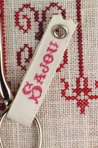 Une des lames de cette petite paire de ciseaux se termine pour un bout arrondi, ce que l’on appelle une lentille. Cela permet, par exemple, lorsqu’on coupe un tissu pliĂ© en deux, d’ĂŞtre sĂ»r de ne pas couper l’Ă©paisseur du dessous, la lame arrondie ne pouvant pas y pĂ©nĂ©trer. Ces ciseaux en acier nickelĂ© sont utilisĂ©s pour le boutis.
