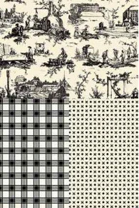 Il s’agit ici du motif coordonné n° 2, un motif à carreaux dans les tons noir et crème. Les liens sont faits dans le même tissu. La grande poche de devant est dans le motif principal représentant les étapes de fabrication de la Toile de Jouy à la Manufacture Oberkampf. La bavette est taillée en arrondi et mesure en haut 24 cm. Le lien passant autour du cou mesure 60 cm. Les liens de tour de taille mesurent chacun près d’un mètre, ce qui permet à ce tablier d’être porté par toutes les statures. Cela permet également de le nouer devant.