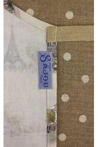 Tablier de cuisine en tissu de coton Ma belle ville de Paris en tissu de coton. Il s’agit ici du motif principal, montrant une vue panoramique de la ville à l’aquarelle. La grande poche de devant est dans le coordonné 1, un motif répétitif de tours Eiffel et d’arcs de triomphe avec drapeau français. Les liens sont faits d’une sangle de lin de 2 cm de large qui, tous les 8 cm, est sérigraphiée du nom de Sajou en bleu. La bavette est taillée en arrondi et mesure en haut 24 cm. Le lien passant autour du cou mesure 60 cm. Les liens de tour de taille mesurent chacun près d’un mètre, ce qui permet à ce tablier d’être porté par toutes les statures. Cela permet également de le nouer devant.