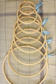 Si vous brodez un tissu fragile, il peut être souhaitable d’enrouler un morceau de ruban ou de biais autour du cercle le plus petit, de manière que le tissu soit moins marqué par le serrage du tambour.