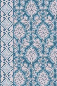 Deux coupons de tissus Damas bleu à grand motif damassé, son coordonné à croisillons bleu et deux bobines de fil à coudre de coton n° 6774 (Bleu) et n° 6108 (Gris clair).