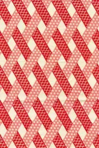 Trois coupons de tissus Damas rouge, grand motif damassé dans les rouge, rose et écru et ses deux coordonnés, croisillons et petits pois sur fond rouge.