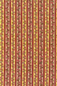 Deux coupons de tissus Léontine, le motif principal alliant couronnes et rayures et son coordonné à rayures, avec deux bobines de fil à coudre de coton n° 6270 (nacre) et n° 6597 (bois de rose).