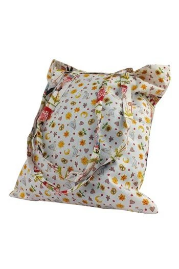 Pour ce sac rectangulaire, nous avons choisi deux tissus de notre collection Farandole alsacienne, le tissu principal et le coordonné n° 1 à petits motifs. Les anses mesurent 62 centimètres et sont faites dans le tissu principal.