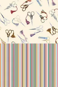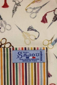 Pour ce sac rectangulaire, nous avons choisi deux tissus de notre collection Ciseaux Sajou, le tissu principal et le coordonné n° 1 à rayures. Les anses mesurent 62 centimètres et sont faites dans le tissu principal.