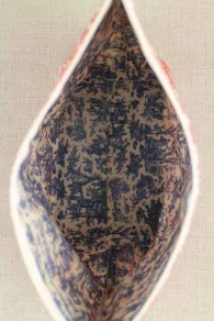 Grande trousse en toile enduite dans notre tissu Offrande à l’Amour miniature rouge. Elle est doublée du même tissu en bleu.